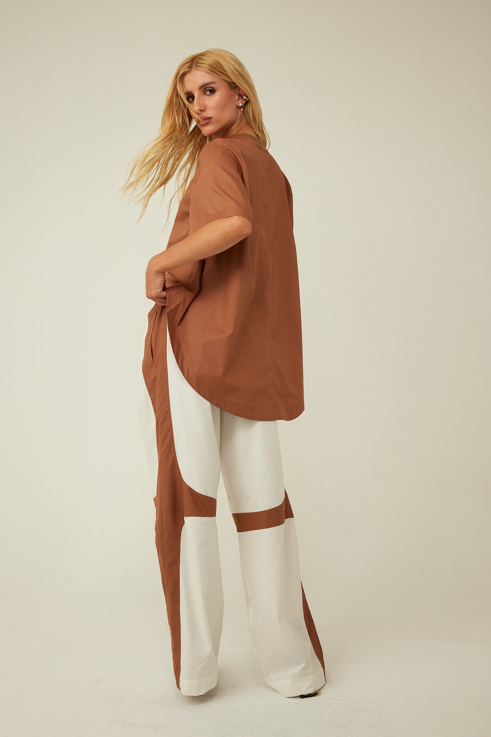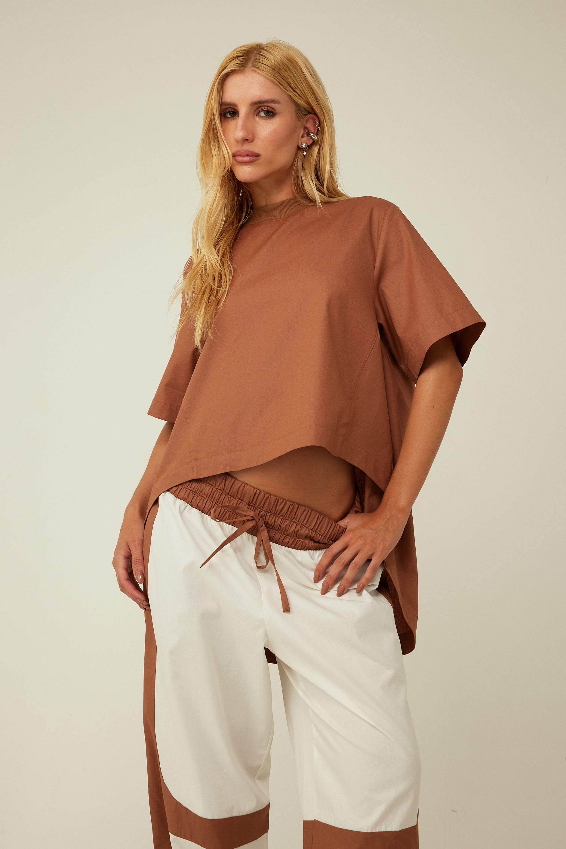 Blusa mullet com modelagem ampla, gola com ribanna, confeccionada em tricoline.