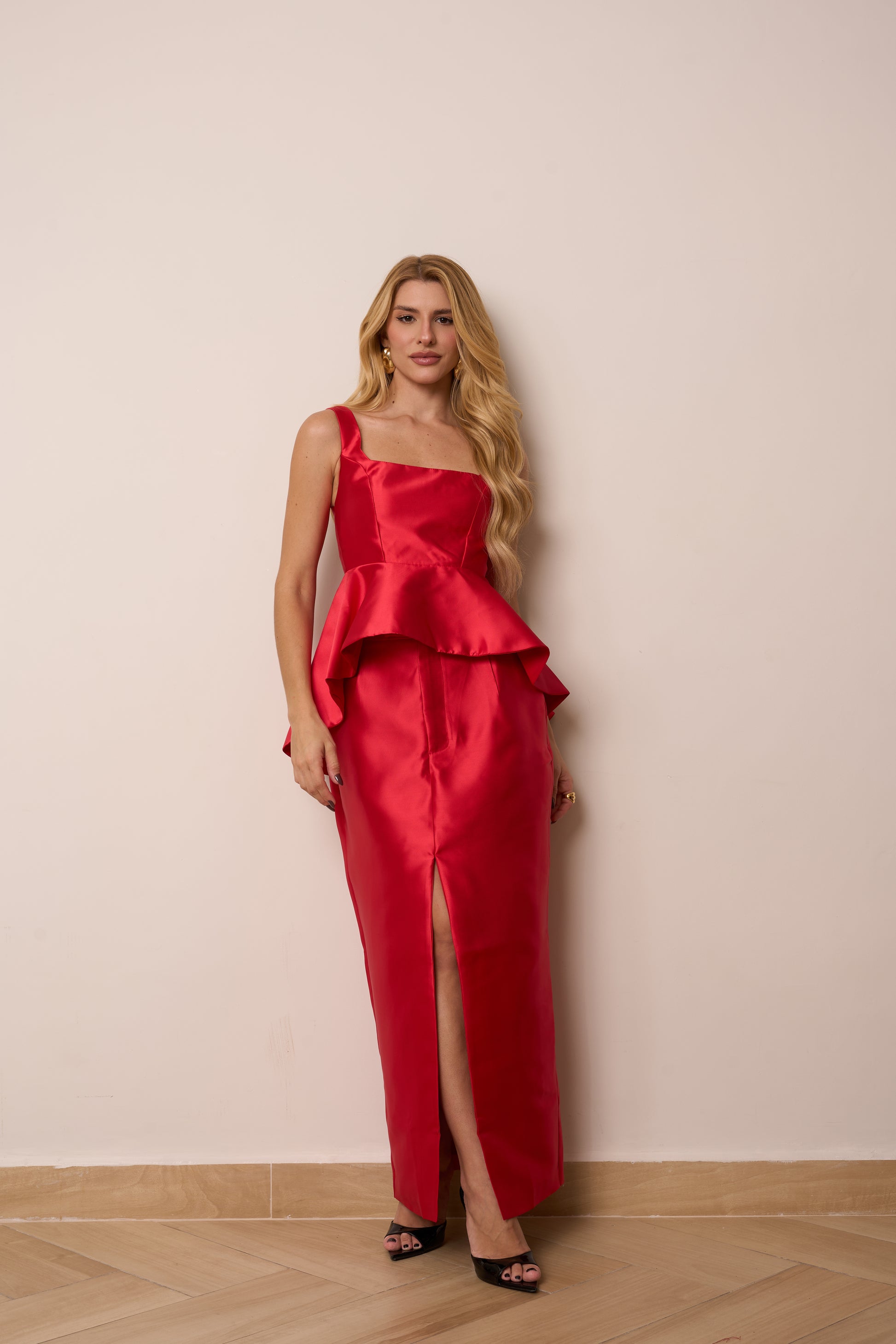 Blusa com alça, modelagem ajustada no busto com peplum mulet. Tecido estruturado com brilho acetinado.