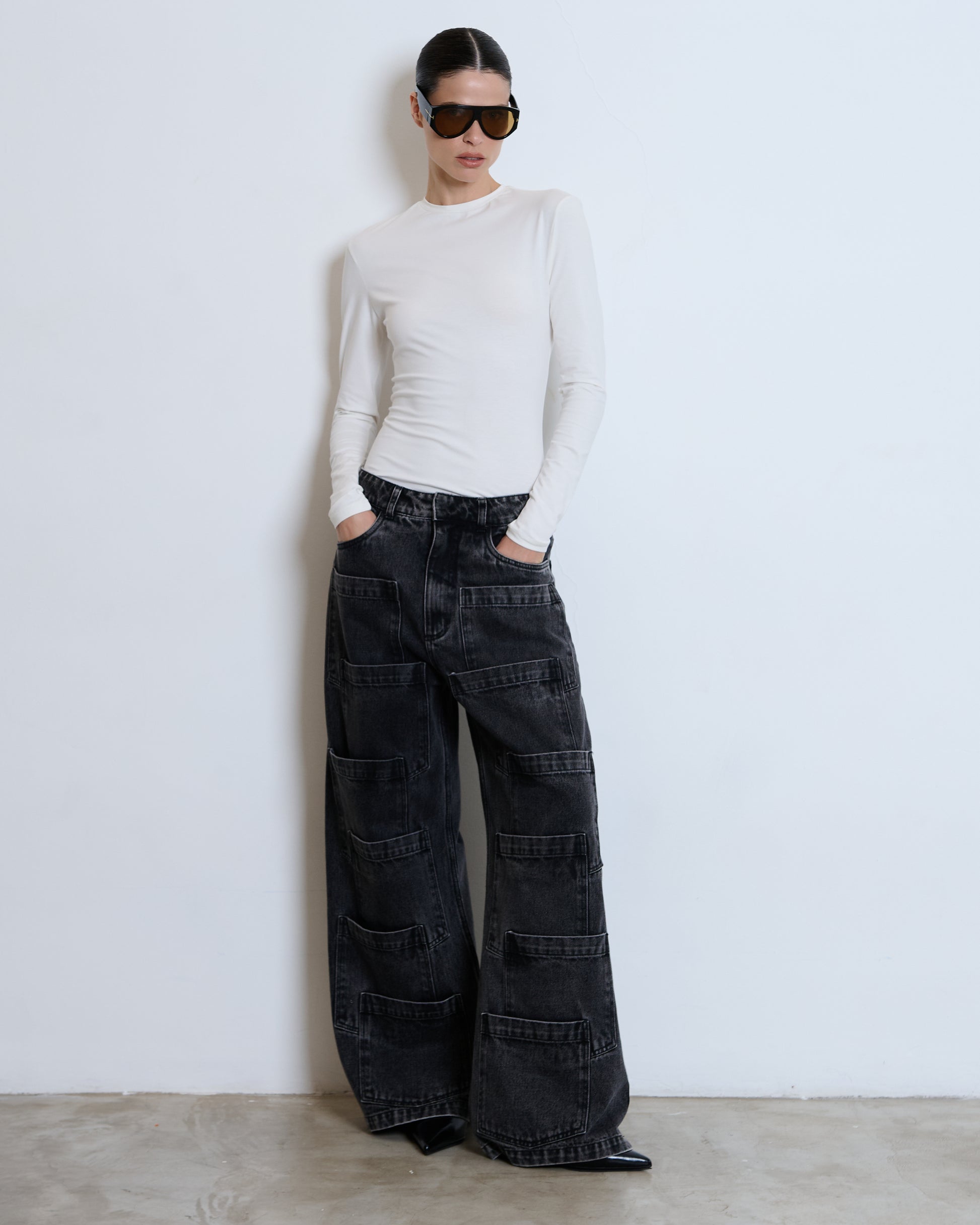 Calça em jeans preto estonado, com proposta urbana e contemporânea. Apresenta modelagem wide leg, com pernas amplas e caimento reto, garantindo conforto e presença no look. Possui recortes horizontais ao longo das pernas, que criam textura e um visual utilitário moderno.