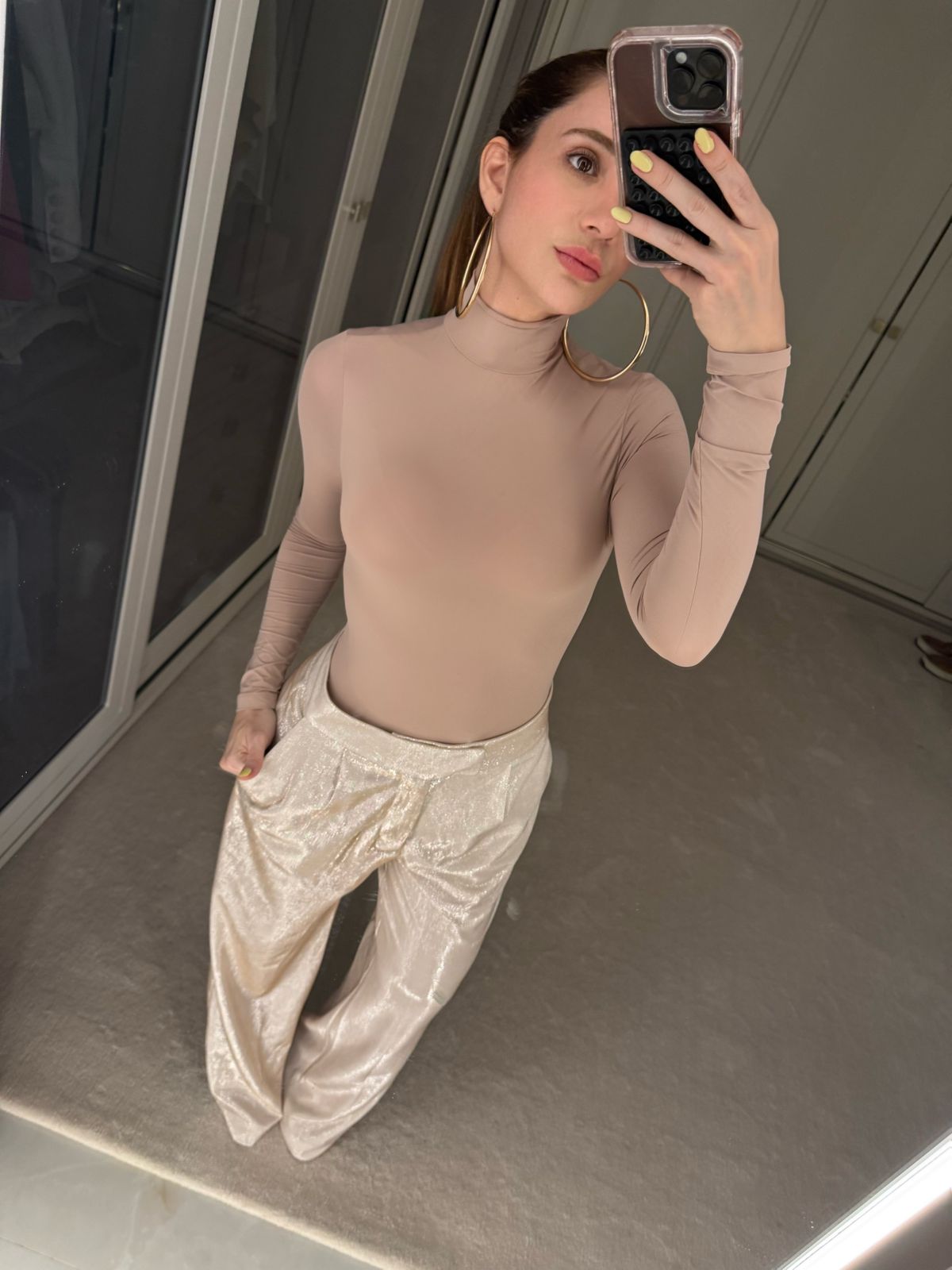 Calça alfaiataria cintura alta, com cintura alta e bolsos. Confeccionado em tecido plano com fios de lurex.