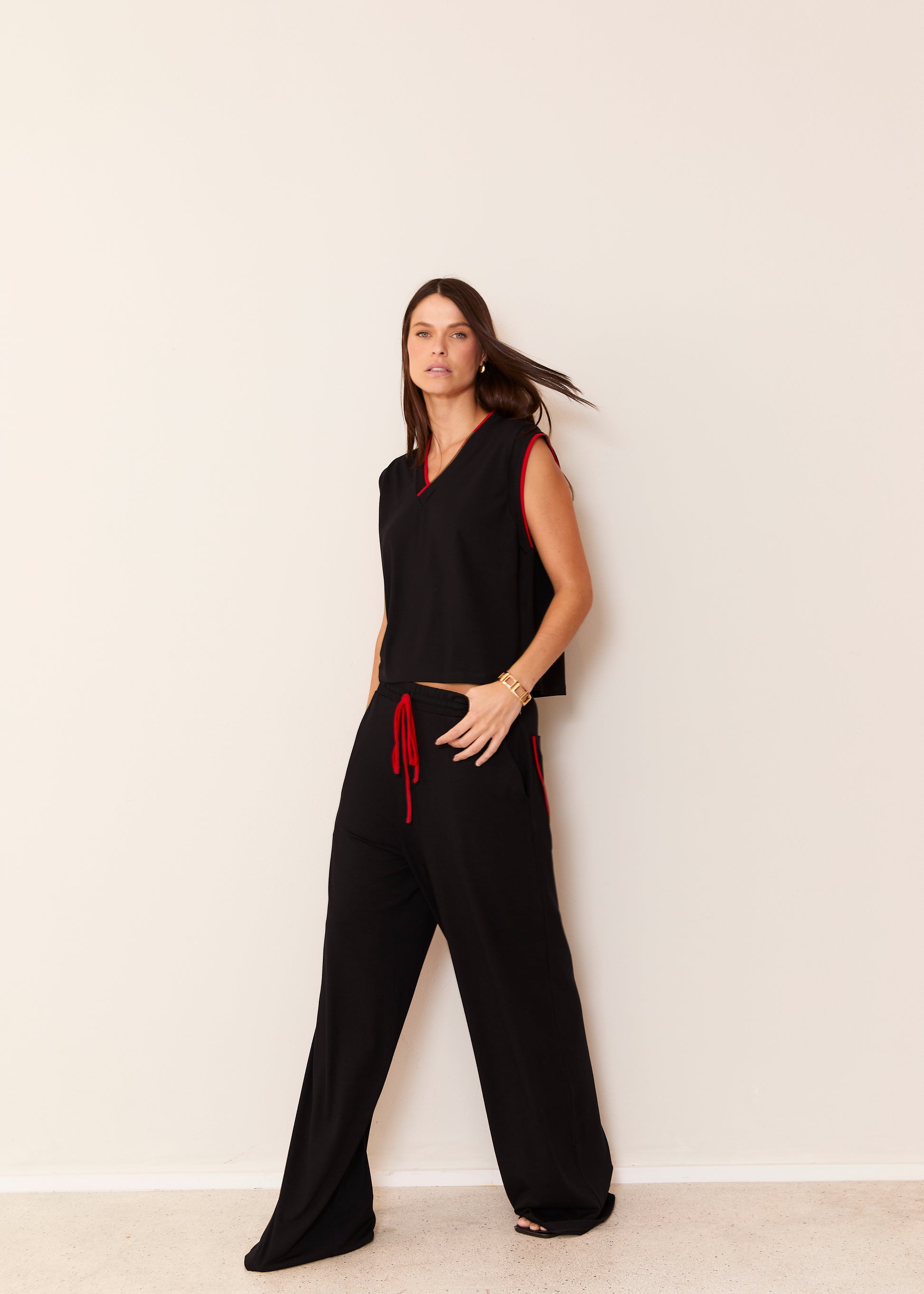 Conjunto de blusa regata com decote V  e detalhe de viés vermelho. Calça cintura alta com elástico no cós e ajustável, possui bolsos e viés vermelho. Confeccionado em malha.