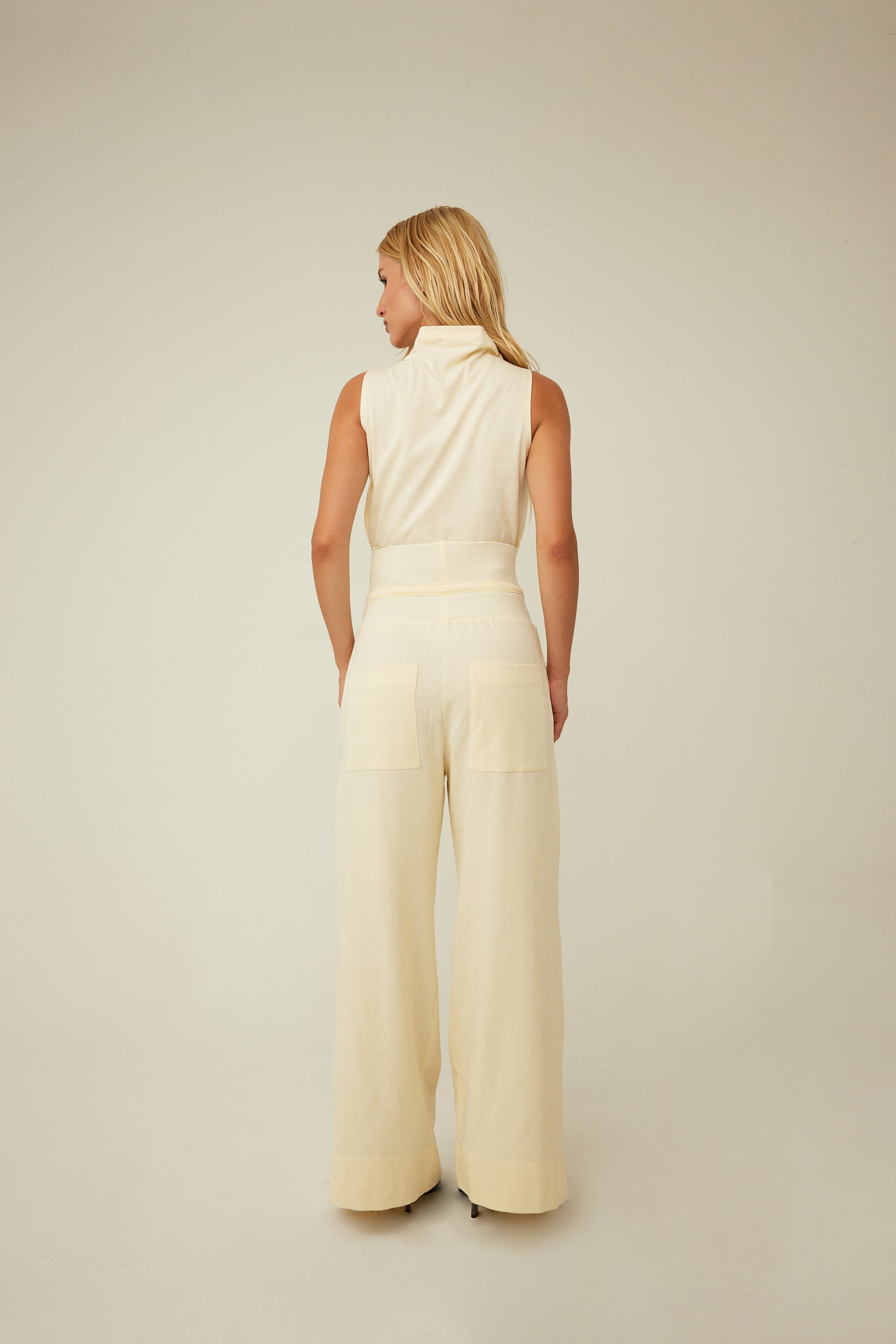 Conjunto de blusa regata com gola alta e calça cintura alta com pala larga cós elástico e ajuste na cintura, possui bolsos. Confeccionado em malha.