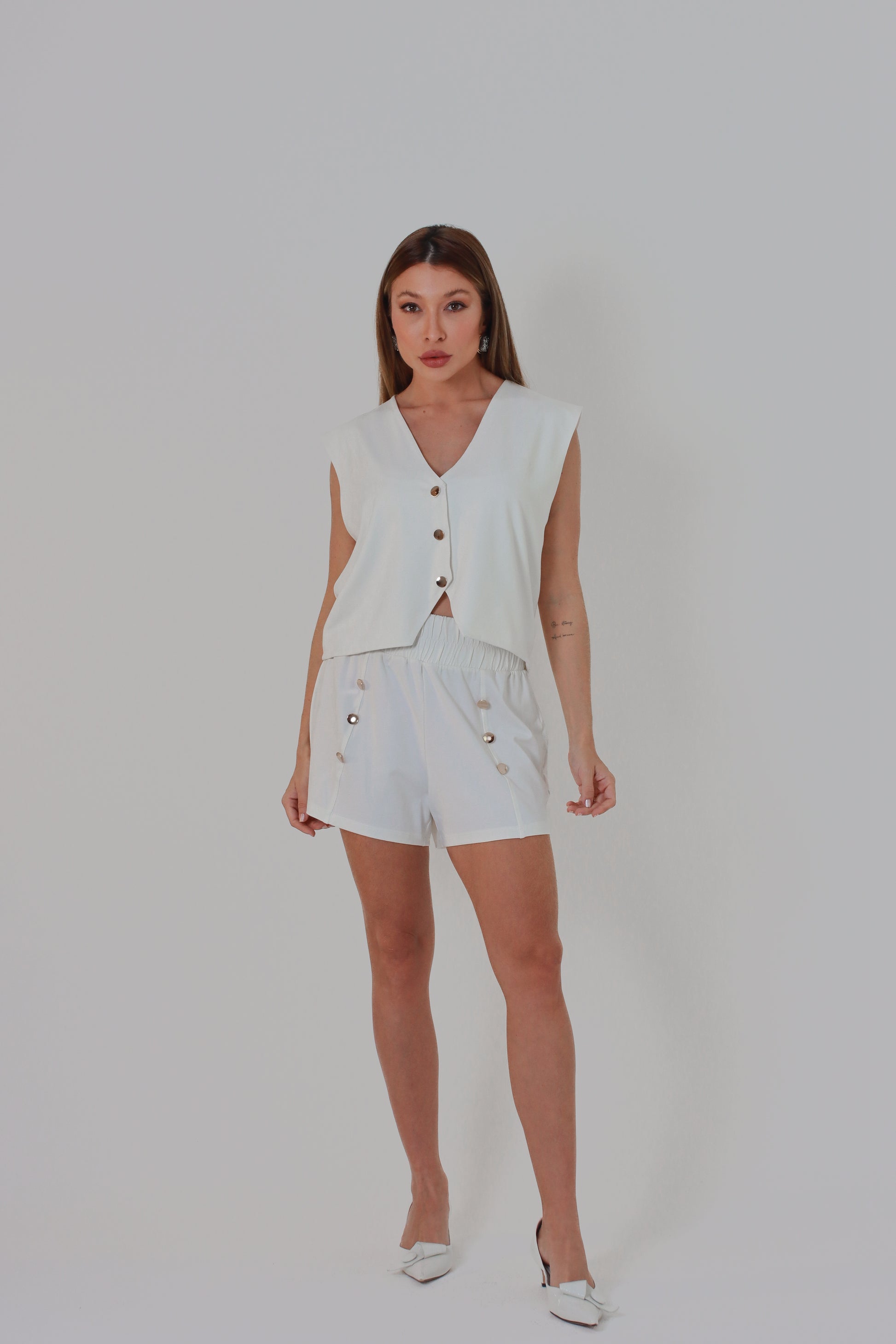 Conjunto blusa com decote V e botões dourados. Short com cós elástico e botões dourados. Confeccionado em malha de viscose