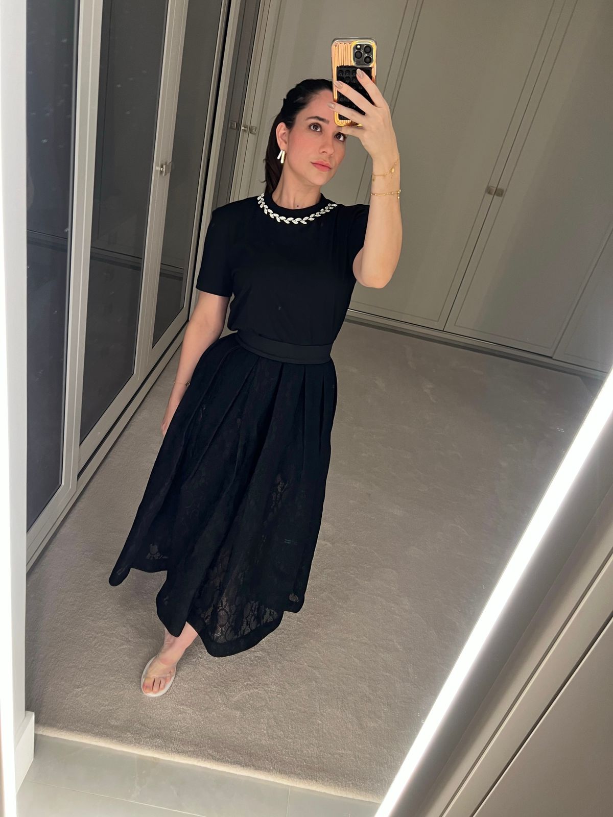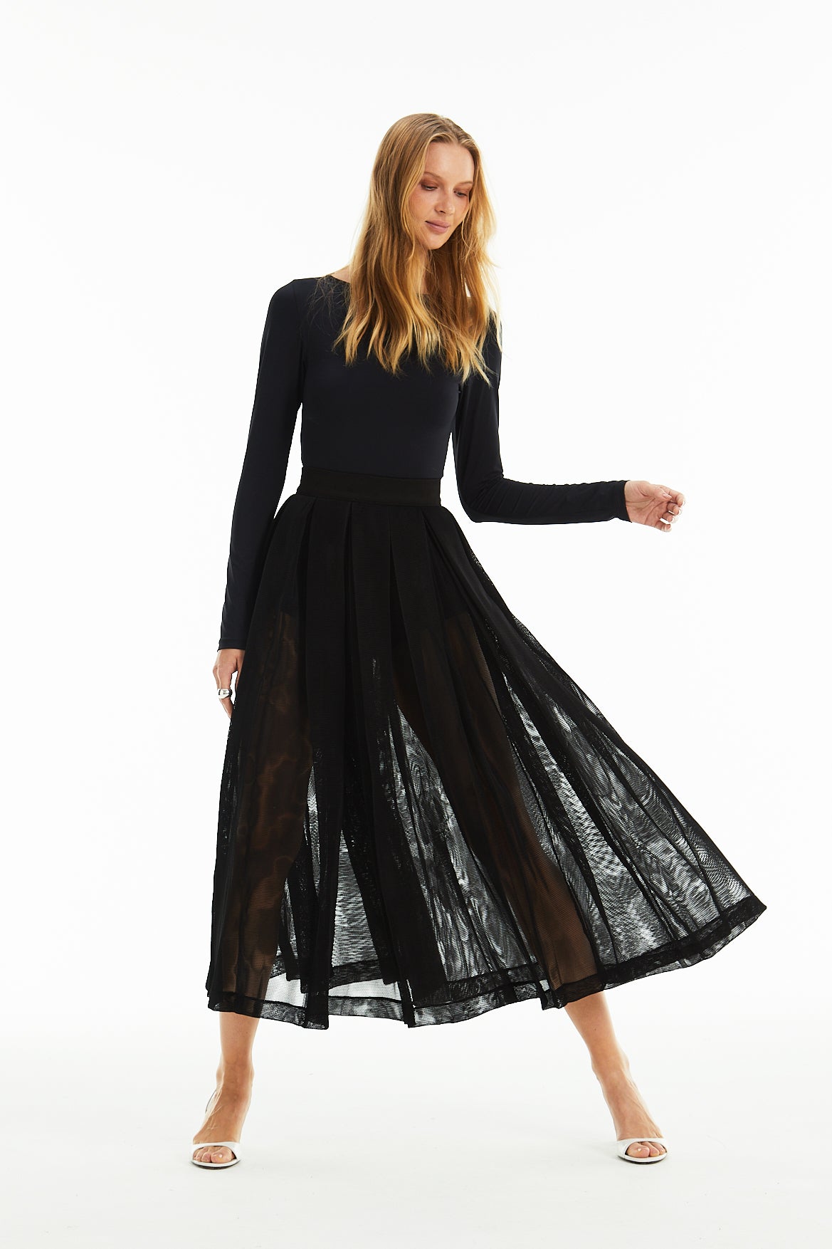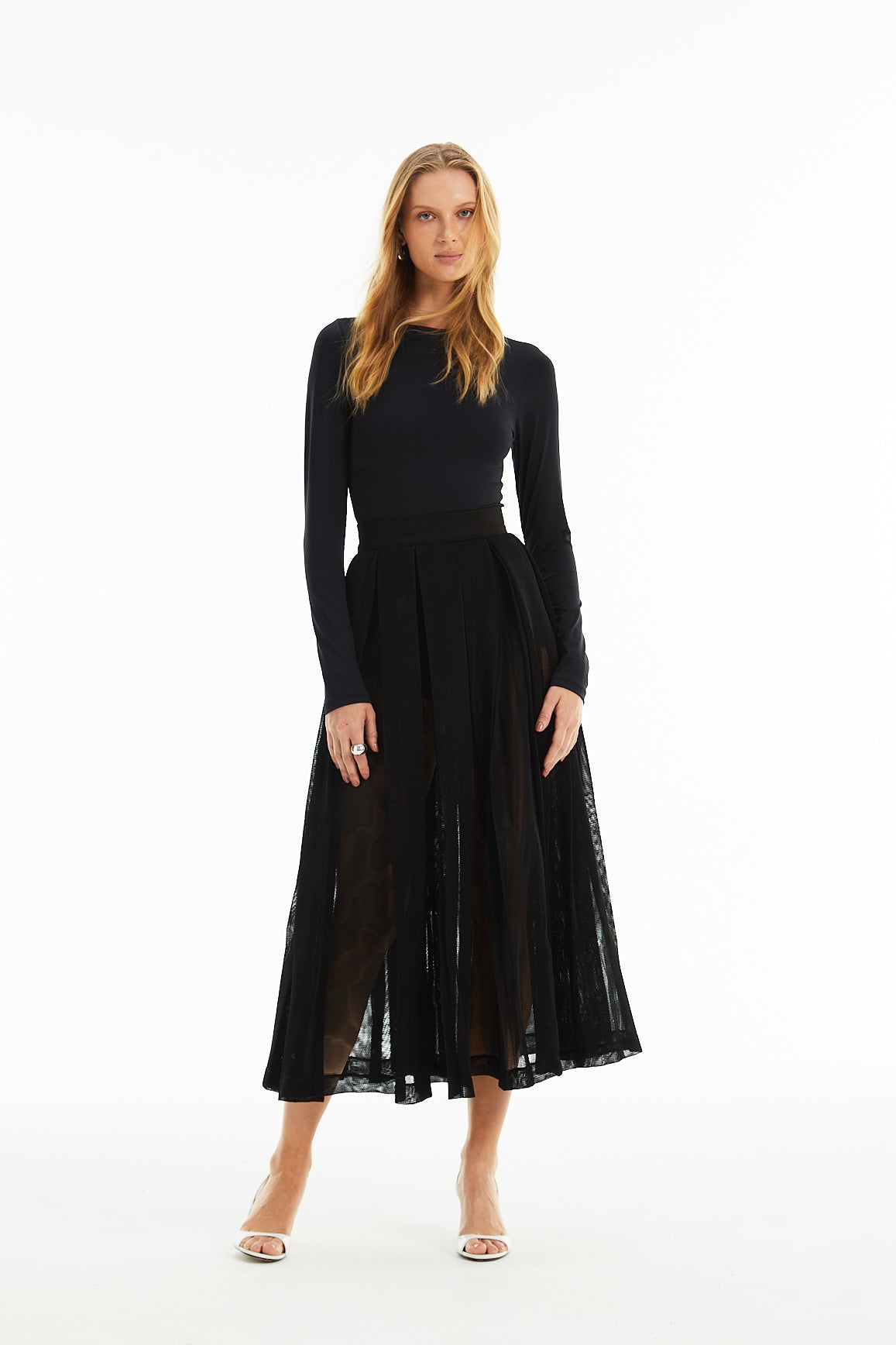 Saia midi cintura alta marcada, zíper nas costas. Tecido de renda acompanha hot pants.