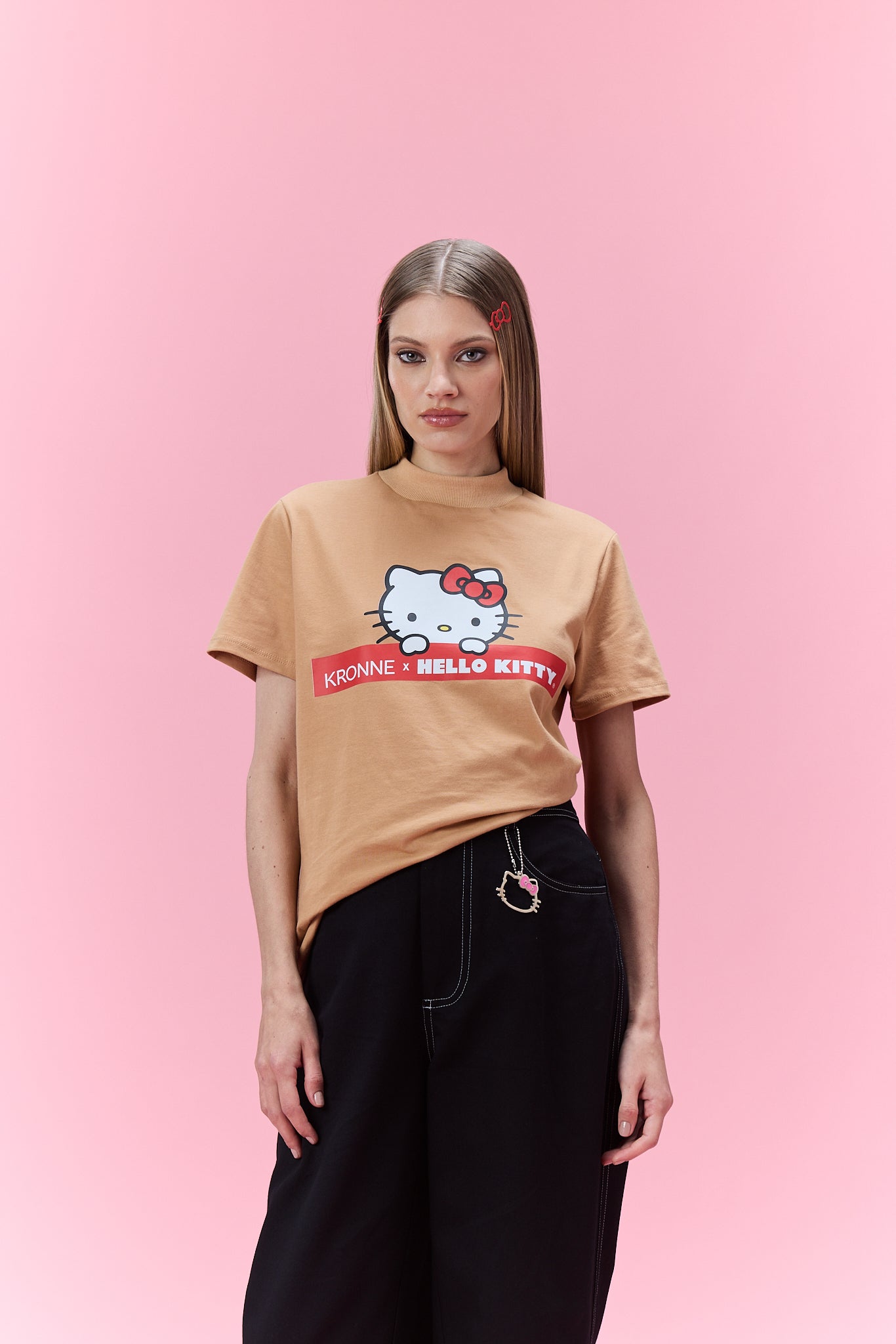 T-shirt gola alta com estampa Kronne e Hello Kitty.