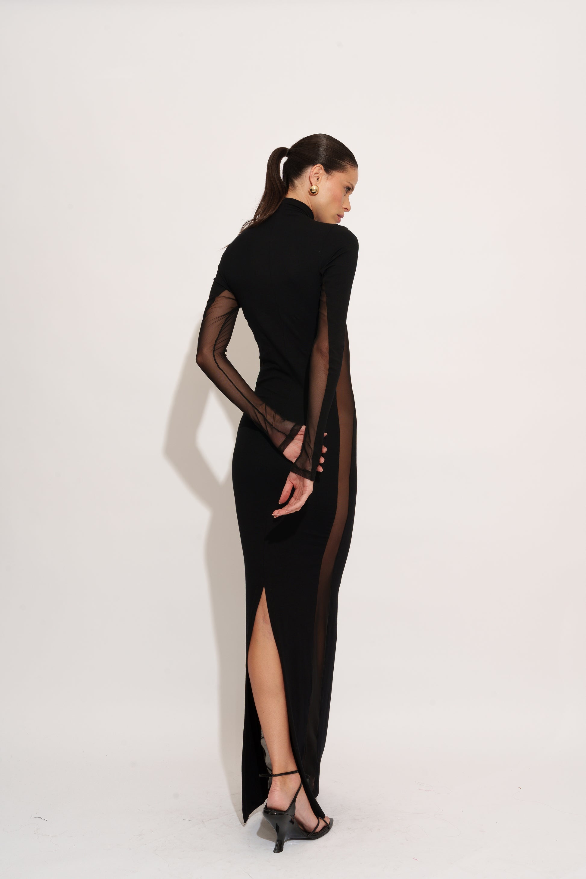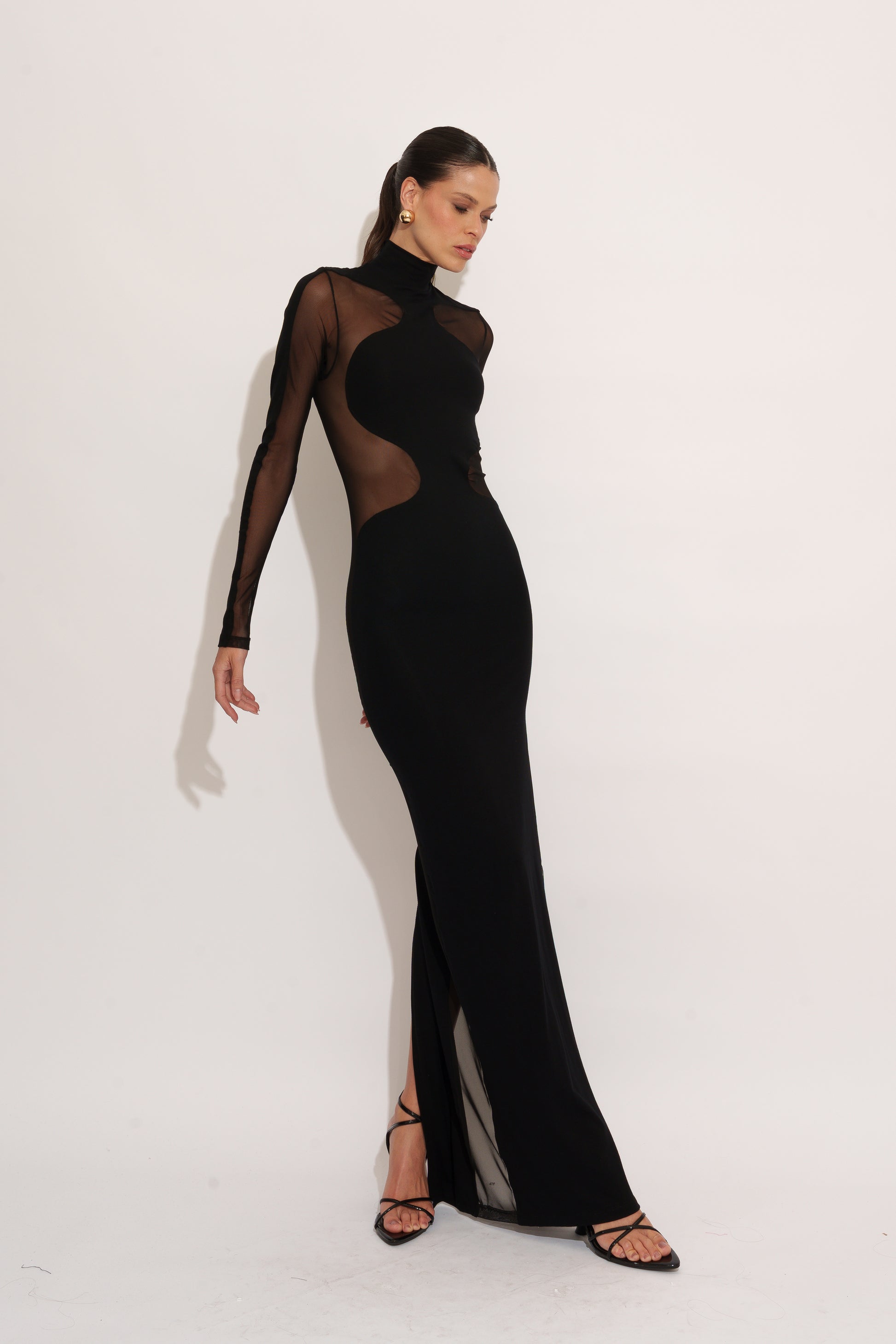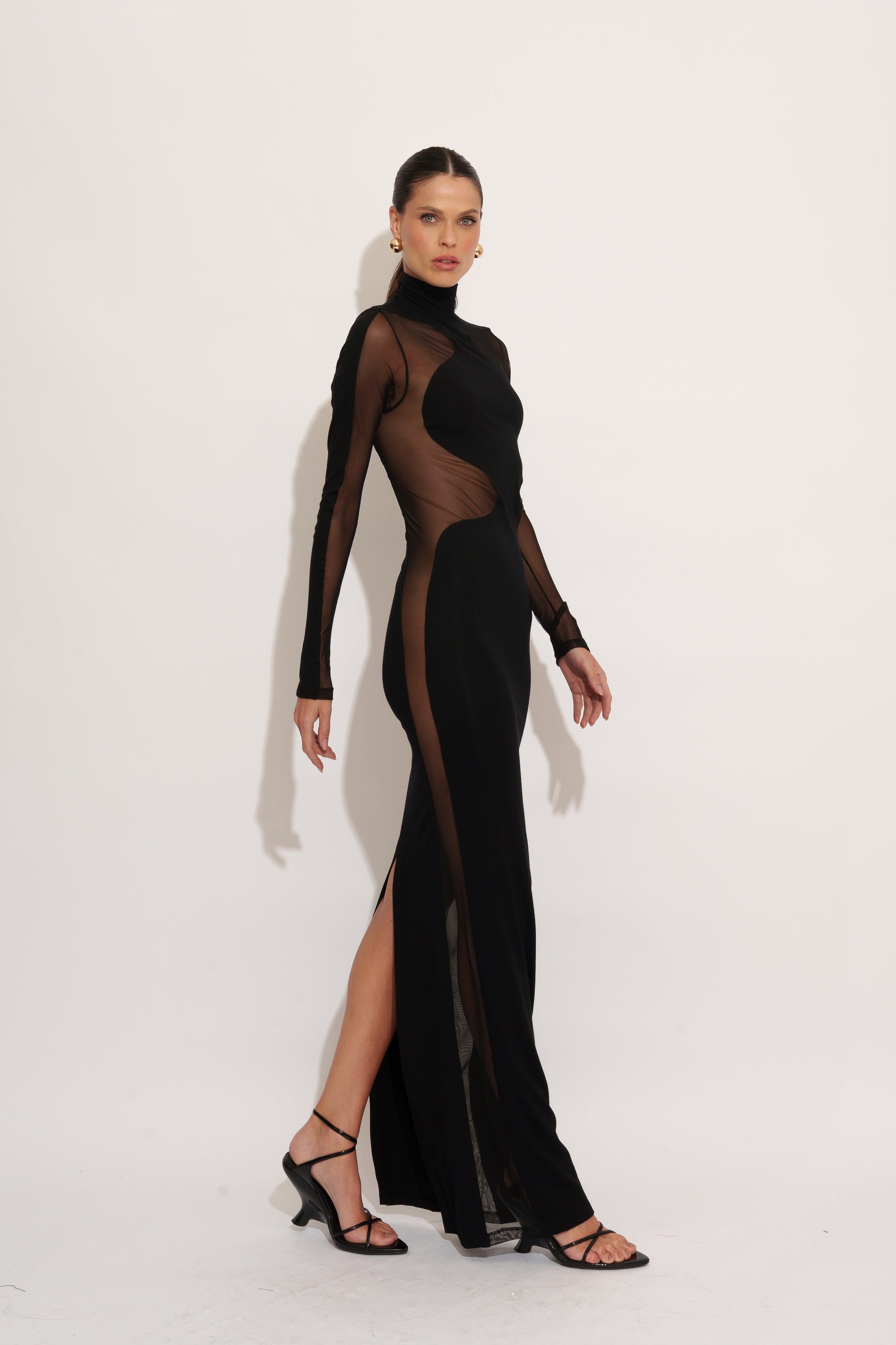 Um vestido sofisticada e extremamente elegante, que equilibra sensualidade e modernidade em um design refinado. Comprimento longo e ajustada ao corpo, com silhueta que valoriza as curvas femininas. Recortes estratégicos nas laterais e nos ombros, também em transparência, adicionando sensualidade de forma elegante.