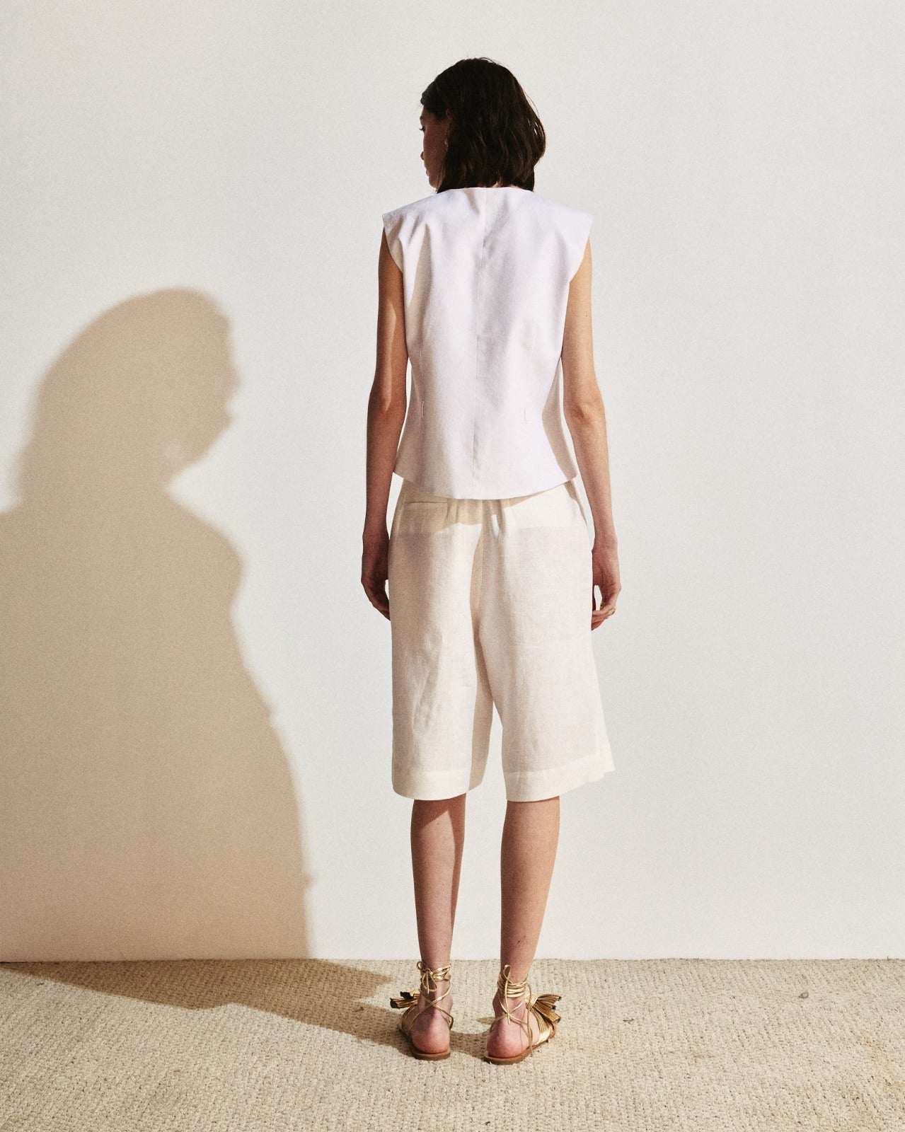 O colete possui modelagem estruturada, sem mangas, com fechamento frontal por botões forrados e cinto do mesmo tecido, que marca a cintura e valoriza a silhueta. O recorte preciso garante um caimento impecável e refinado. Confeccionado em linho.