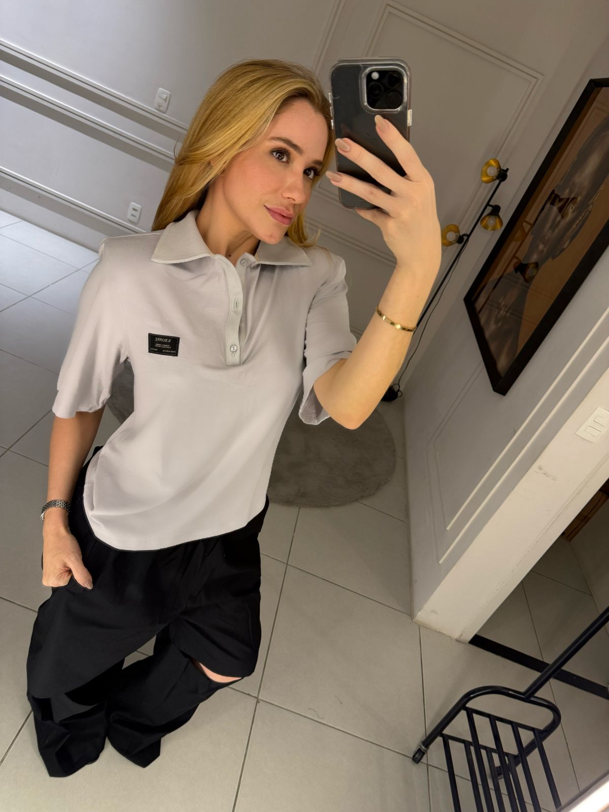 Blusa com gola esporte com ombreiras e etiqueta Kronne. Modelagem ampla e reta, confeccionada em malha premium.