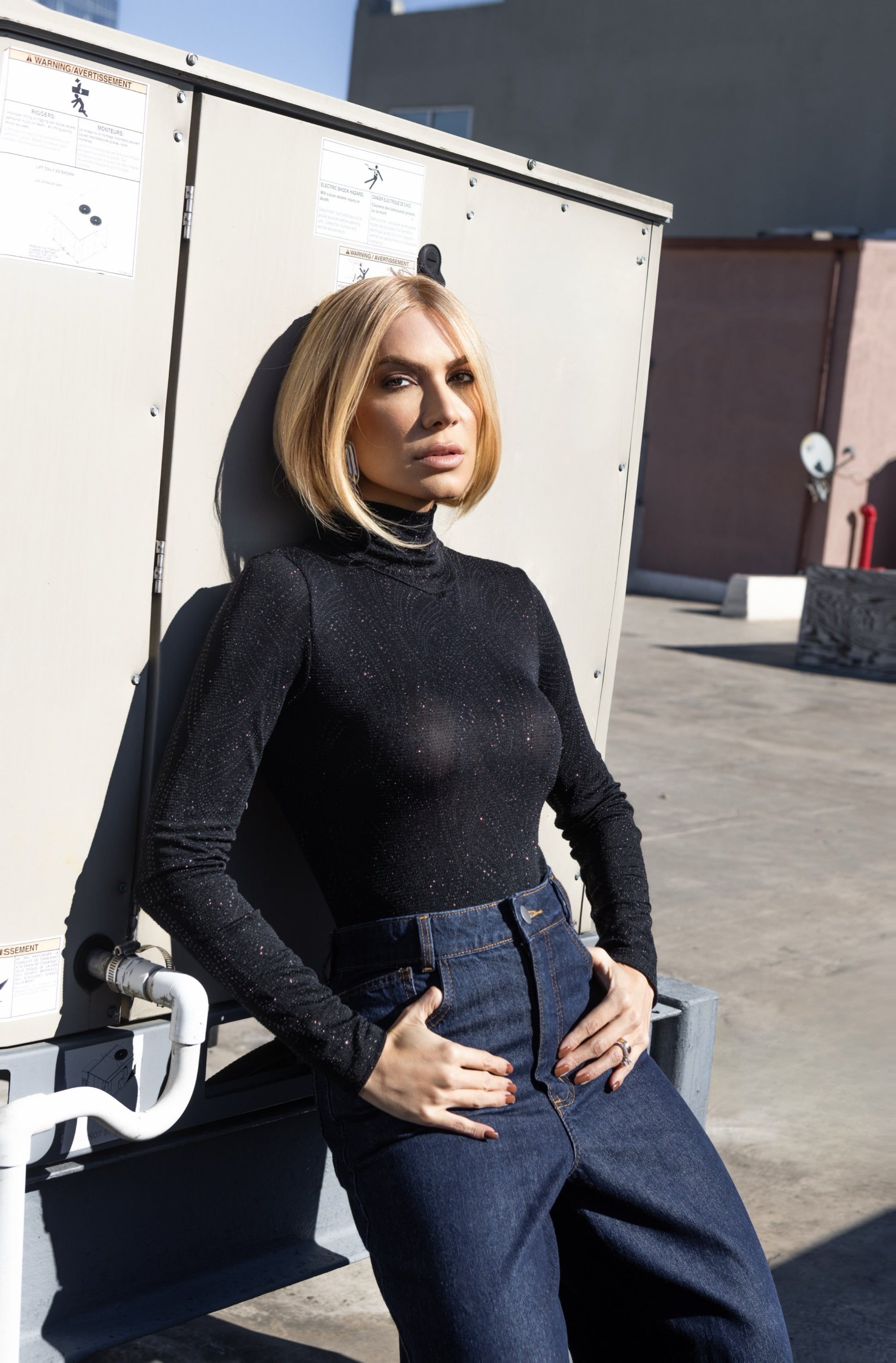 Body gola alta e manga longa com zíper nas costas. Tecido com fios de lurex.