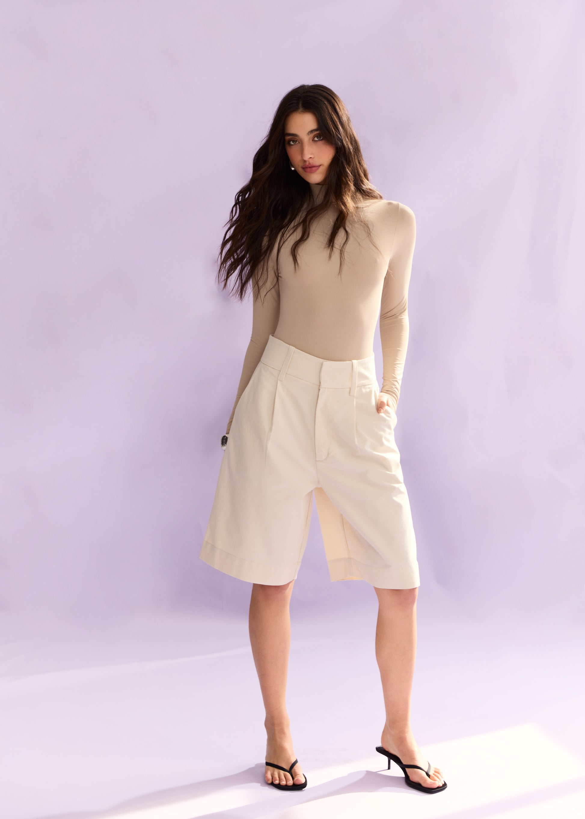 Bermuda alfaiataria com cintura alta e bolsos. Modelagem ampla confeccionado em tricoline.