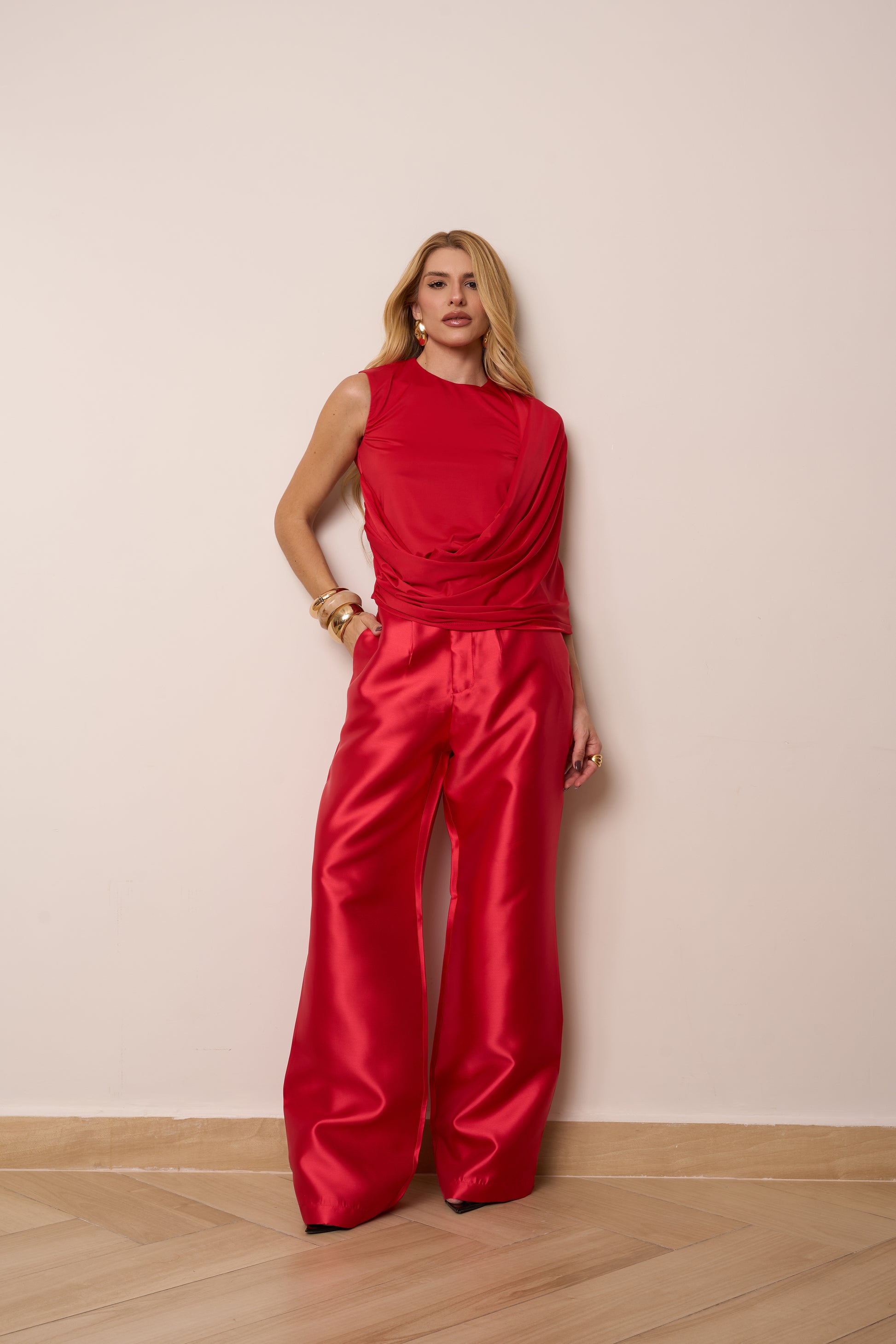 Calça cintura alta com bolsos nas laterais e modelagem reta. Tecido estruturado com toque acetinado.