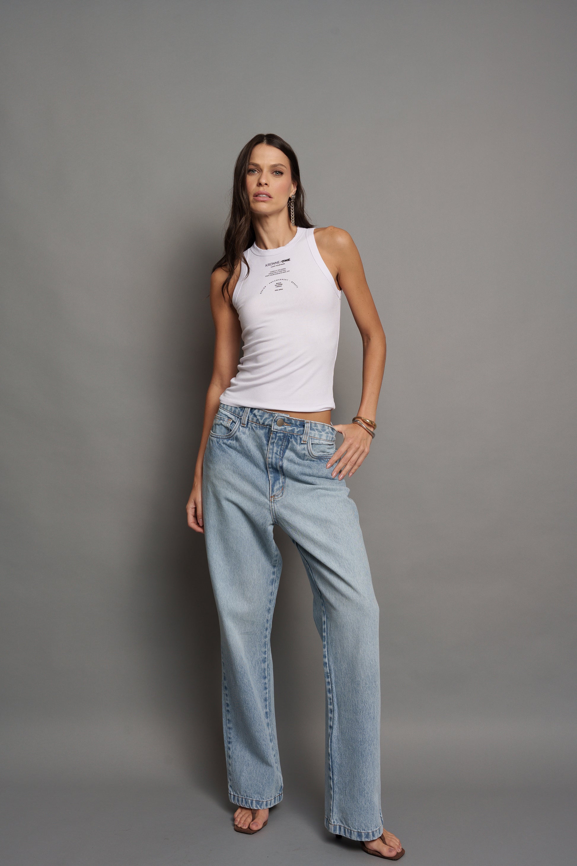 Calça jeans com modelagem reta, cintura média alta com detalhe de etiqueta nas costas.