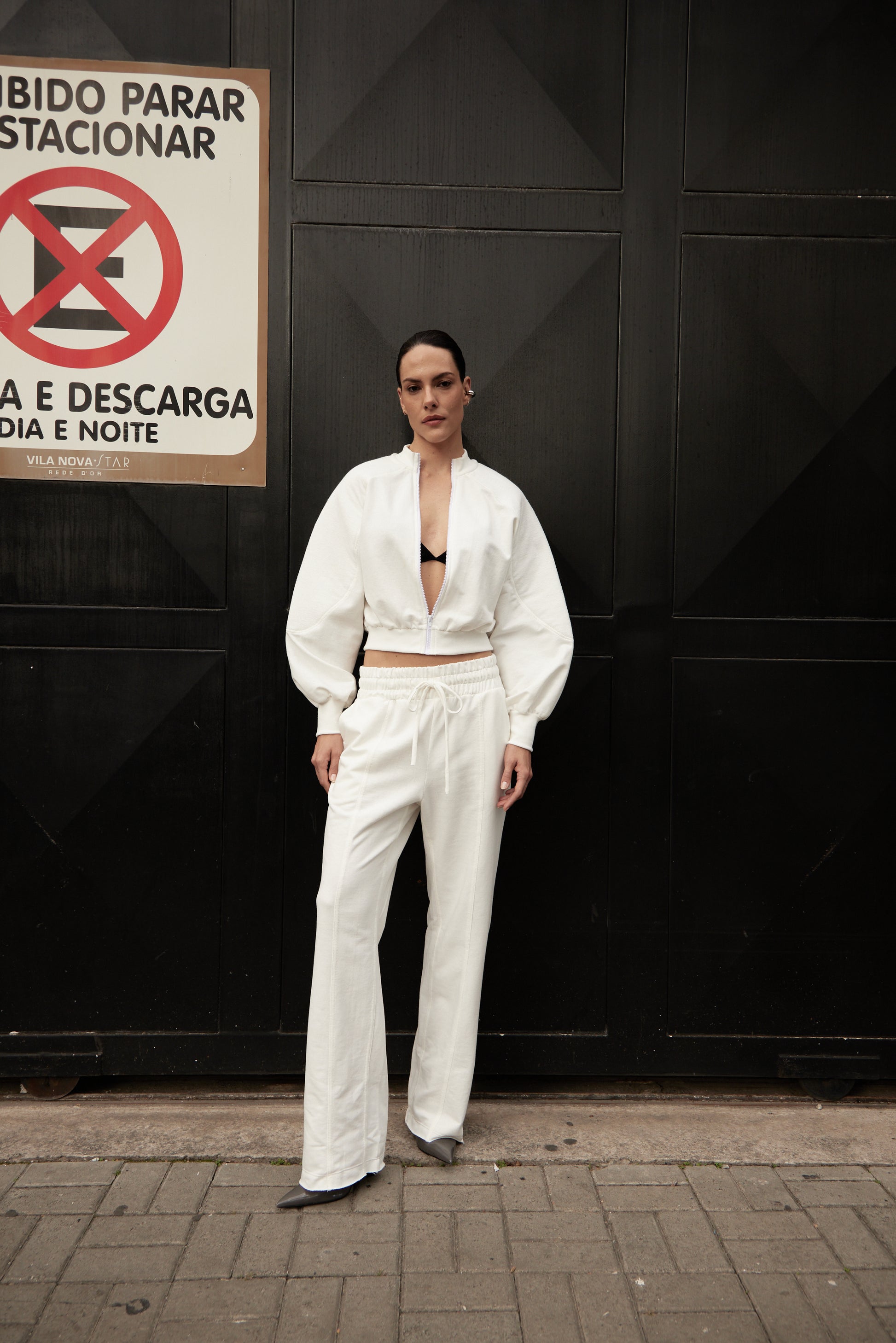 Calça moletom com pesponto na frente, cós alto com elástico e ajustável, possui bolsos