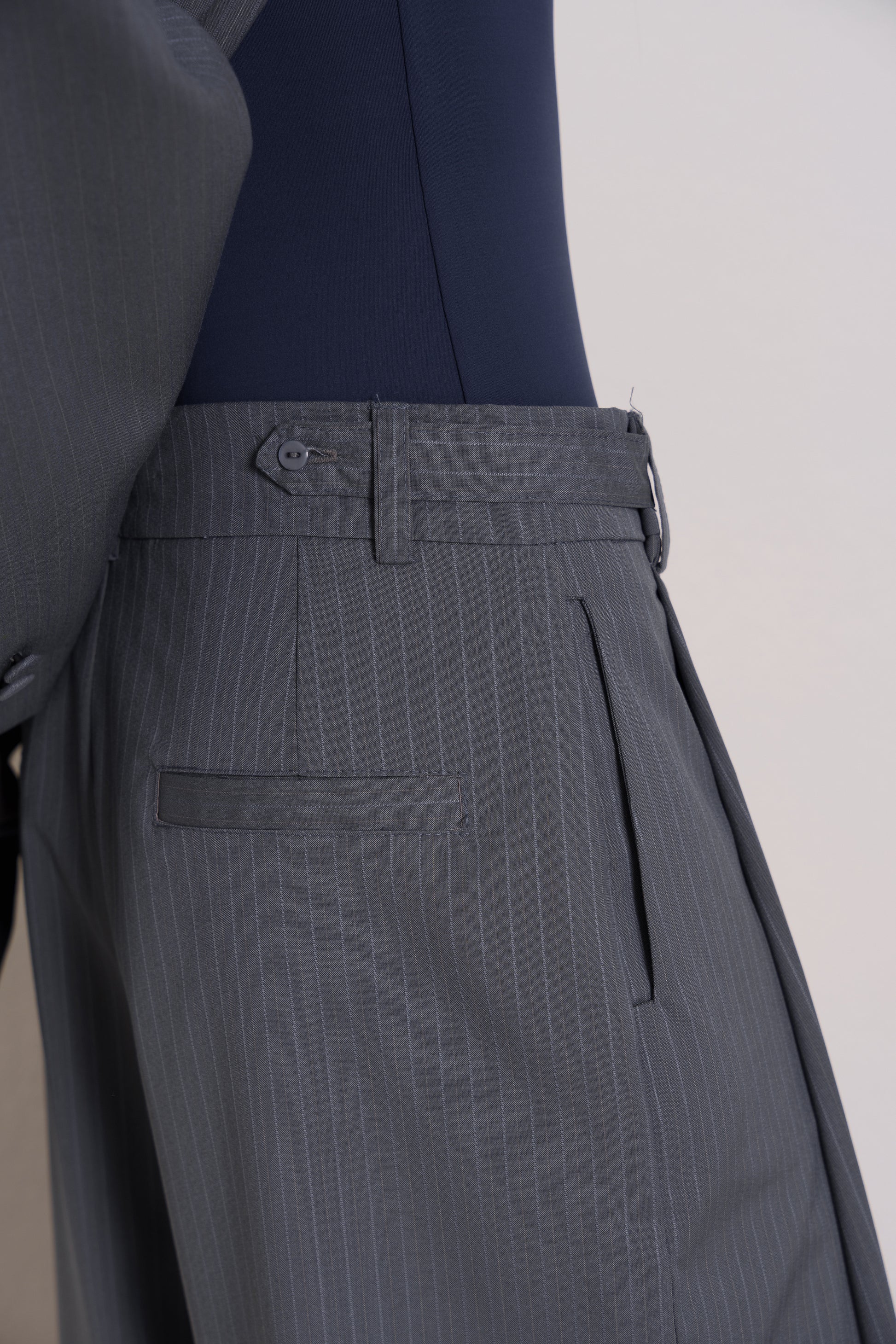 Calça em alfaiataria com modelagem ampla com pregas na frente, detalhe de botão no cós, bolso faca, cintura alta. Estampa em risca de giz.