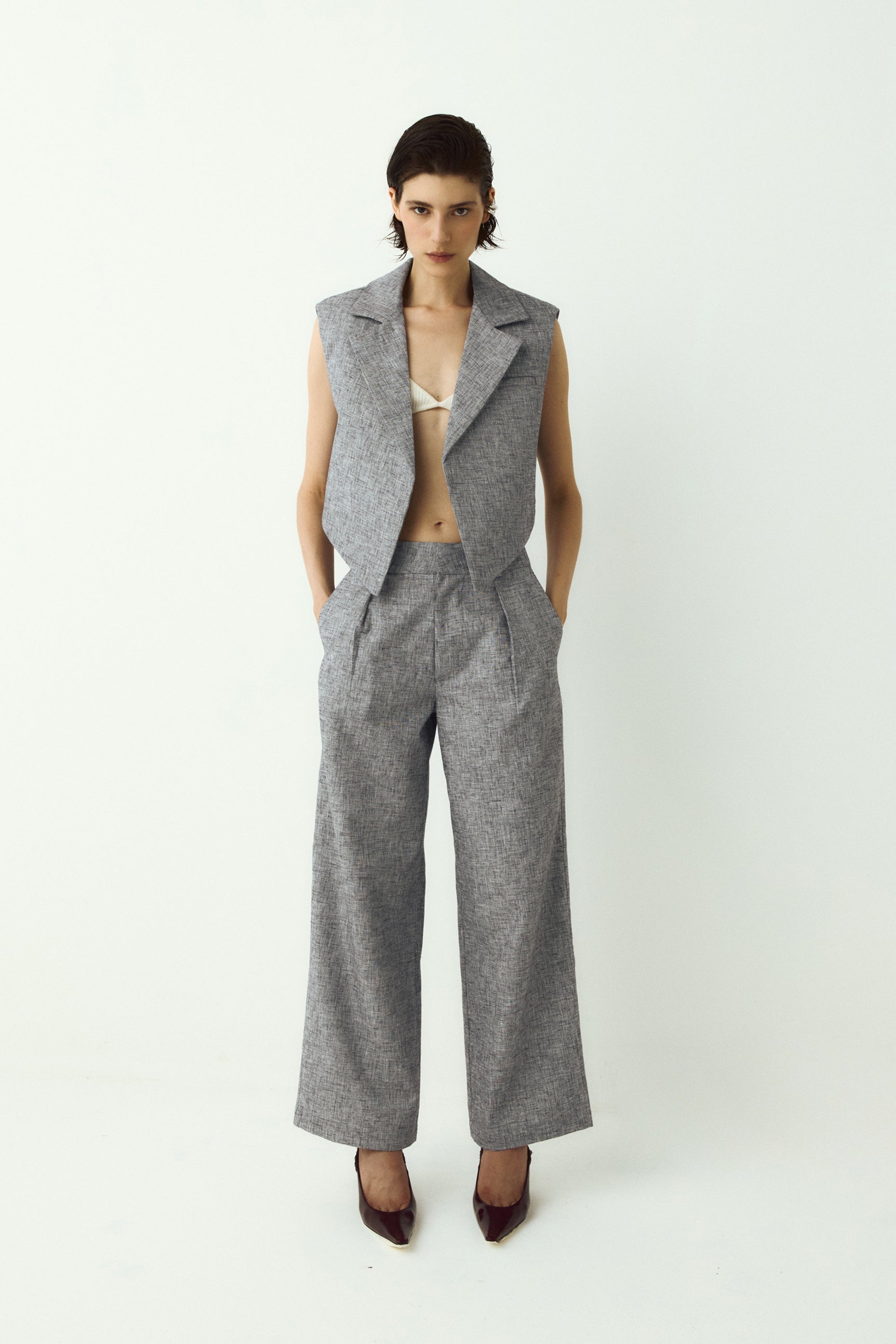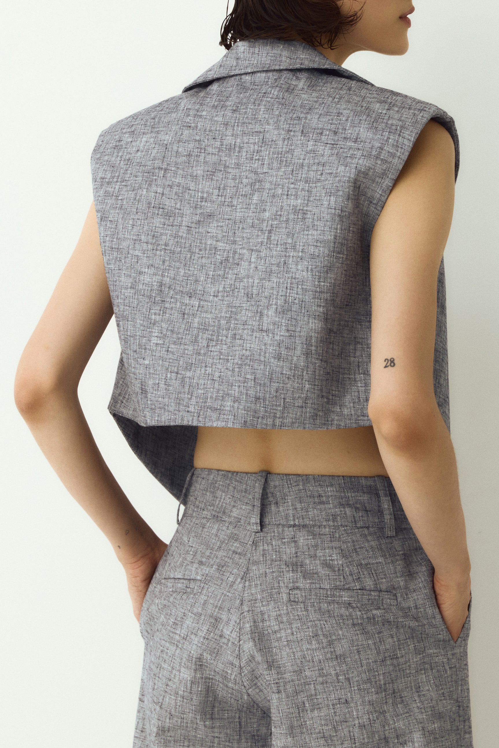 Colete em alfaiataria com gola blazer, modelo estruturado com pontas assimétricas na frente e comprimento menor nas costas.