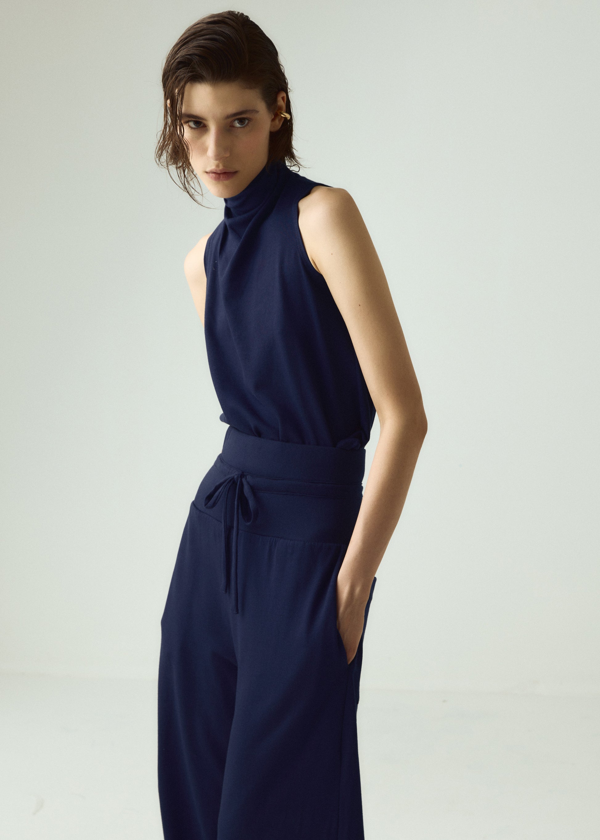 Conjunto de blusa regata com gola alta e calça cintura alta com pala larga cós elástico e ajuste na cintura, possui bolsos. Confeccionado em malha.