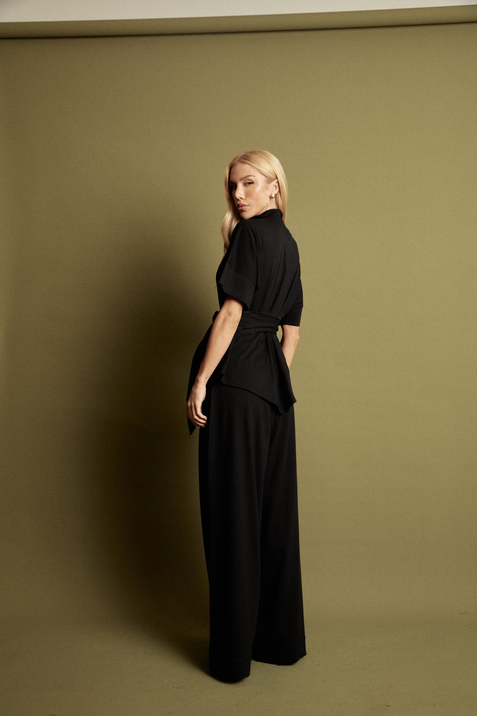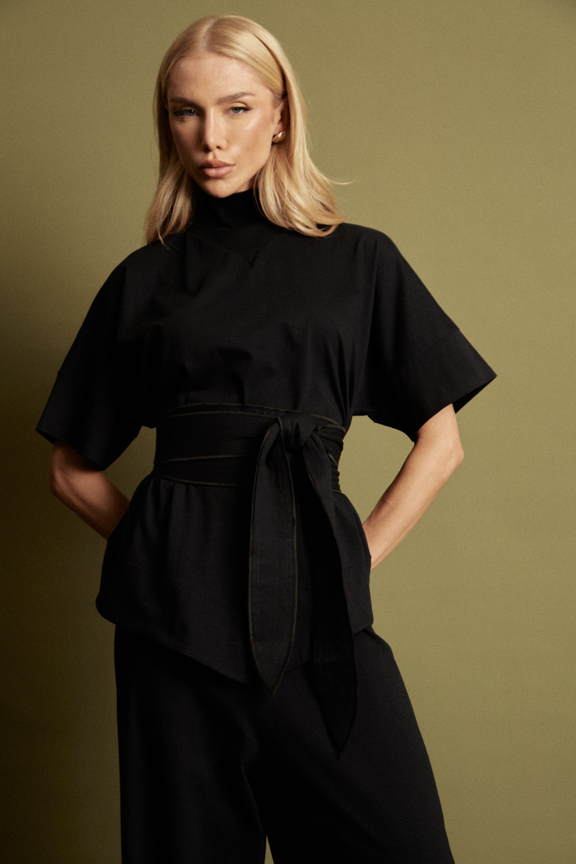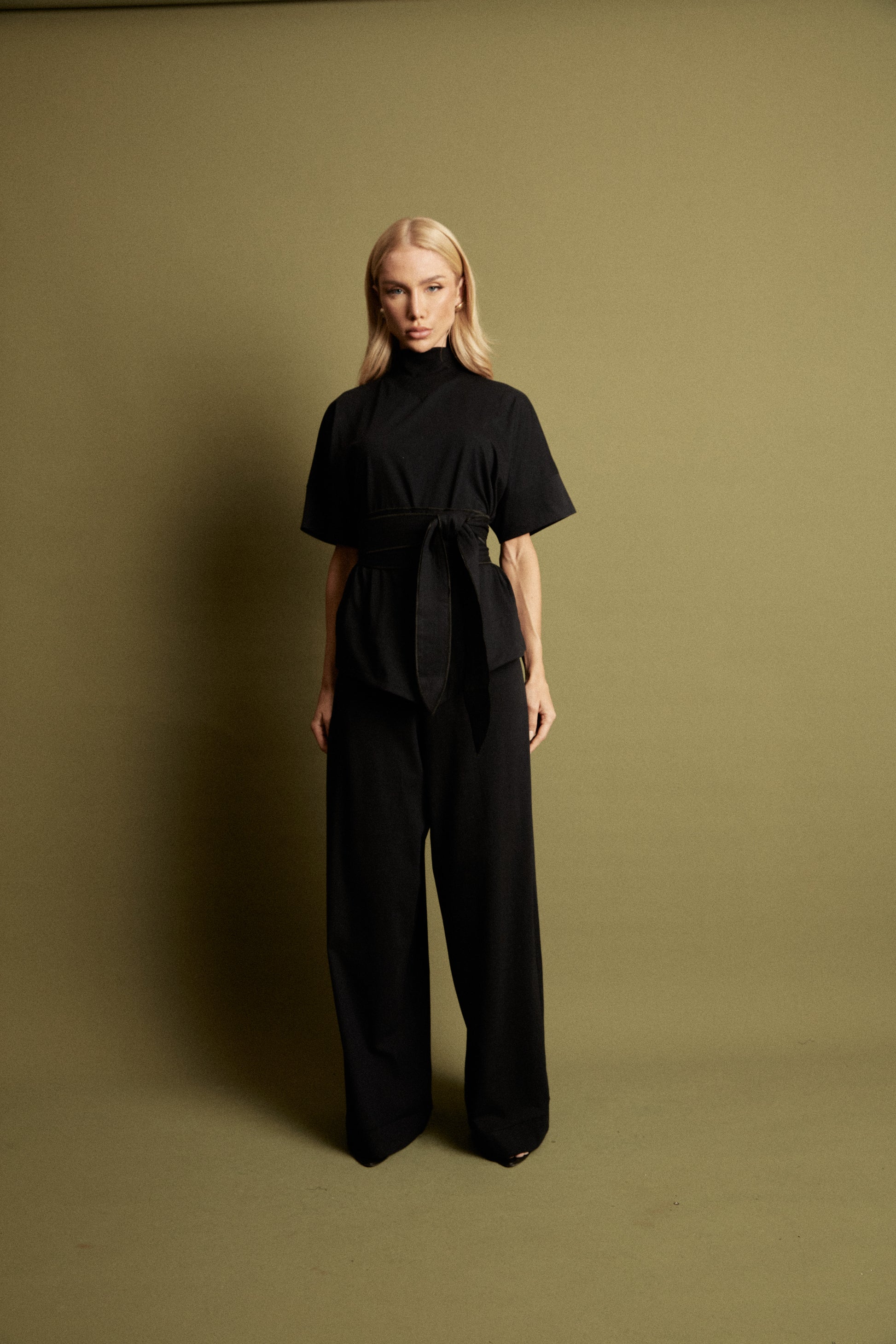 O conjunto é um look minimalista, elegante e poderoso, marcado por proporções amplas e acabamento sofisticado. Blusa com gola alta e manga ampla, barra da blusa arredondada, acompanha faixa. Calça cintura alta com elástico no cós. Confeccionado em malha.