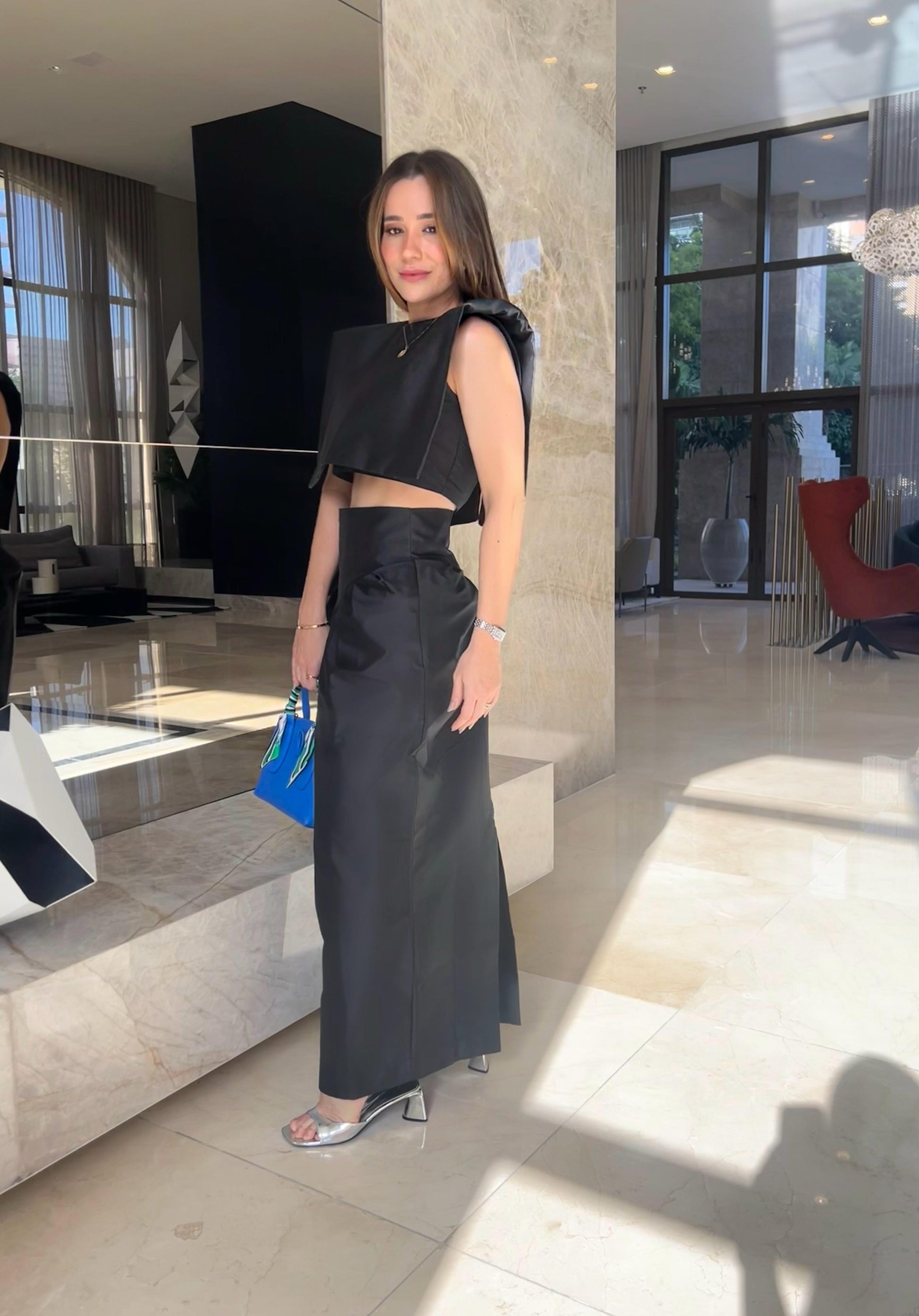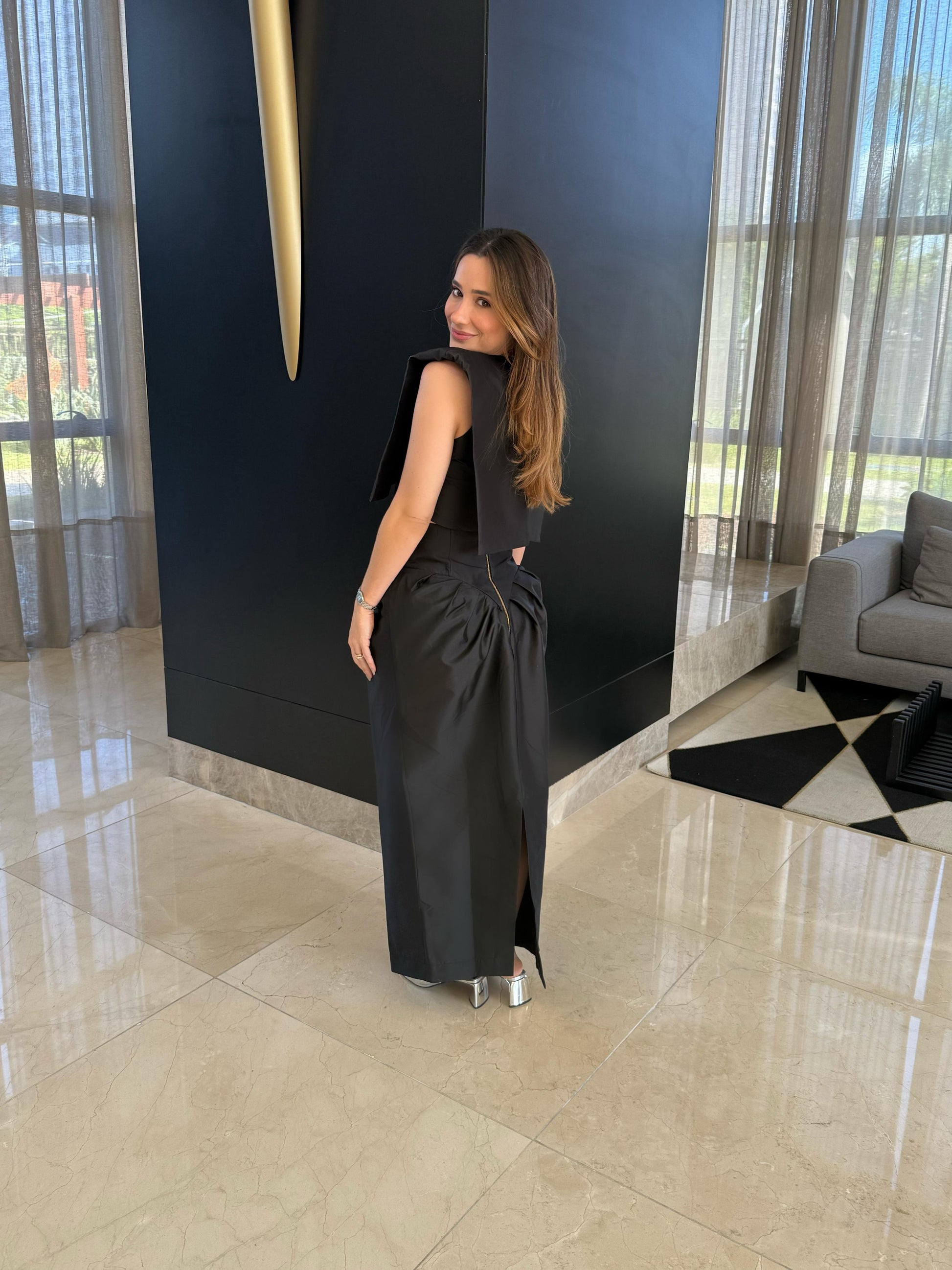 Saia longa com detalhe franzindo no quadril e cintura com recorte V, possui fenda nas costas. Confeccionado em tafetá